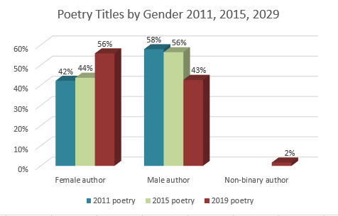 I didn’t repeat the analysis for 2016, 2017 or 2018. I had good intentions, but it takes days and days to do it and I was focusing on other things. However, last year I analysed the titles published in 2019 – but didn’t get around to blogging about it because life got in the way – so here at least is a comparison that can be made between 2015 and 2019, in case anyone is interested. I also have data for poetry titles for 2011, so I’ve added that into the mix. If I find the time to analyse the data for 2020 and/or 2021, I’ll blog about it later this year. (There’s always a delay, because the information I use is published months after the end of each calendar year.)