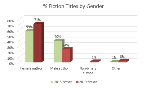Overall, there were 75 fiction titles published in 2015, reducing to 70 in 2019. Not enough data to know if this is a trend.