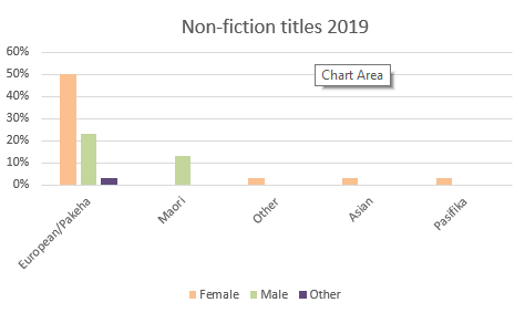 Ethnicity can be trickier to find. If I’ve looked at several sites and there is no mention of ethnicity, I assume the author to be Pākehā. I may miss a few people this way. For books written by multiple authors with different genders and /or ethnicities (eg if a Pākehā man and an Asian woman co-authored a book), I list them as Other. If someone mentions they have a parent who is Māori, Pasifika or Asian, I add the person to the respective group. It’s not perfect, but it does allow me to look at trends over time.