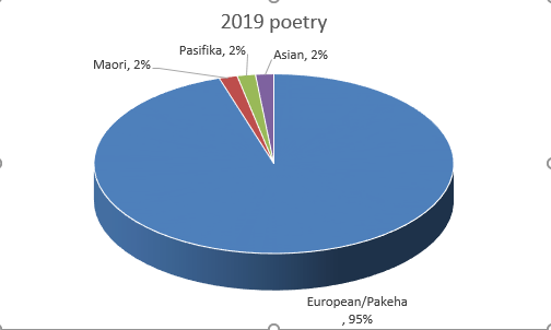 Here’s the miserable poetry pie chart that illustrates how things were in 2019. Pākehā poets were getting a whole lotta delicious poetry pie and 3 poets who weren’t Pākehā managed to get some crumbs. We poets are all very hungry for the pie and there’s less and less of it about, but this is a very sorry state of affairs.
